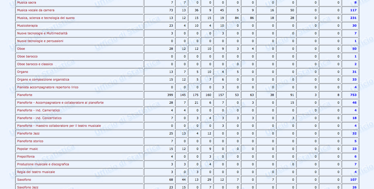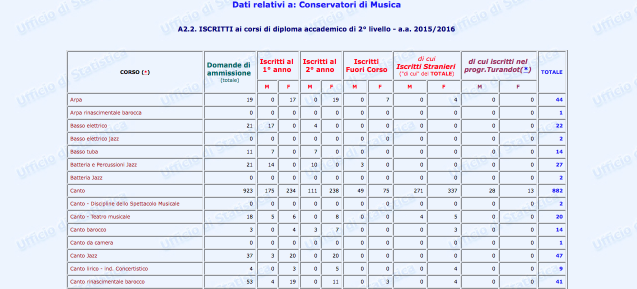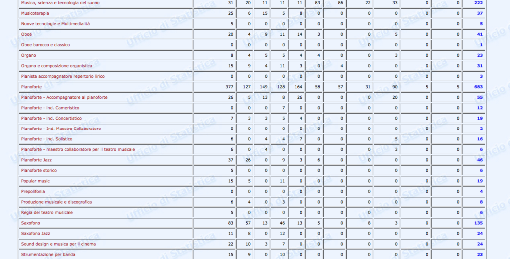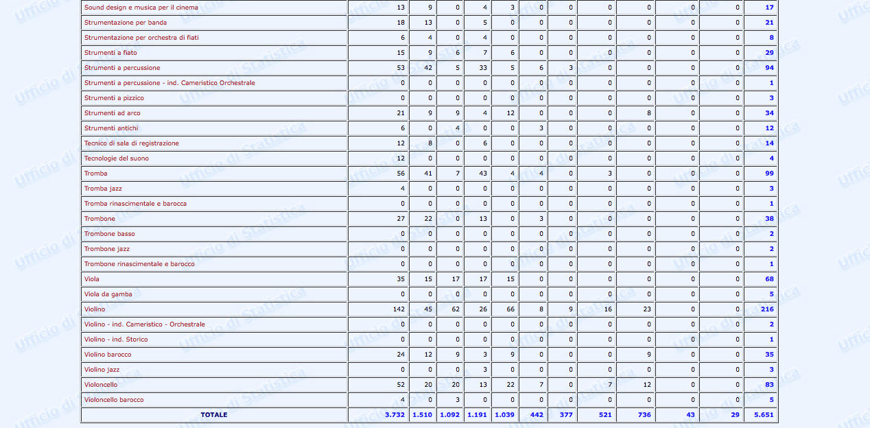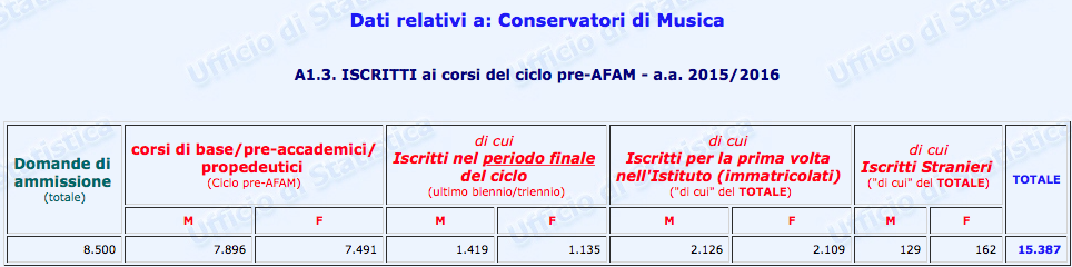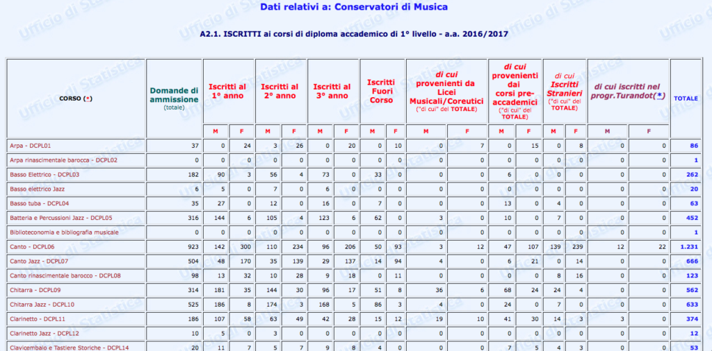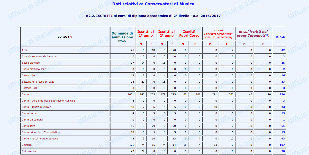 Sono stati finalmente pubblicati i dati statistici relativi al settore Afam per l’a.a. 2016/2017. Non però sul nuovissimo sito ustat.miur.it inaugurato il 9 marzo scorso (il c.d. Portale dei dati dell’Istruzione Superiore), ma piuttosto sul vecchio statistica.miur.it.