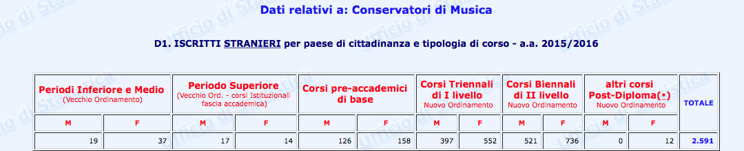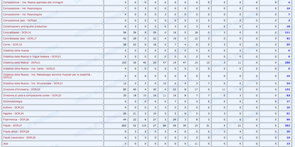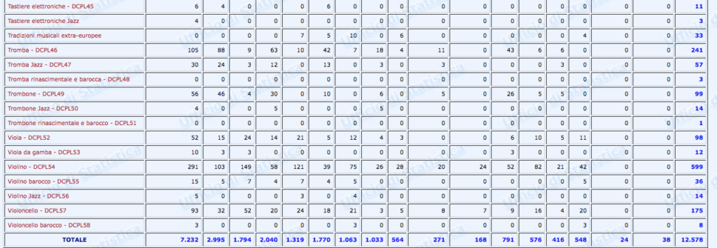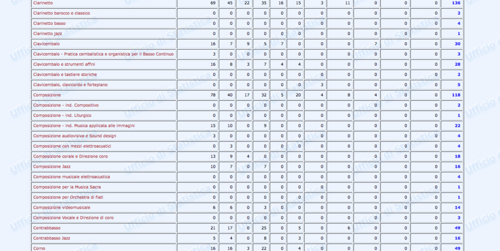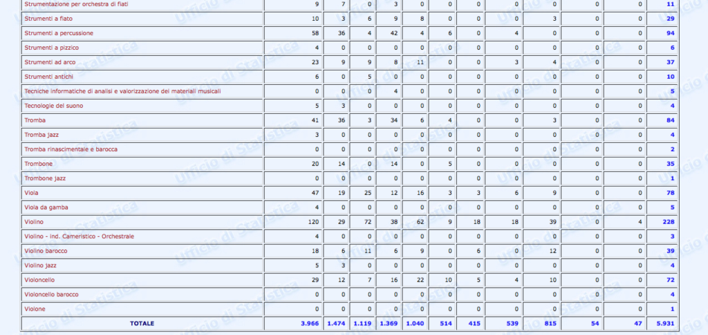 Questa una delle tabelle contenute (p. 308) nel Secondo Rapporto – Monitoraggio sui licei musicali e coreutici pubblicato nel 2016 a cura di Gemma Fiocchetta dal Ministero dell’istruzione, dell’università e della ricerca: